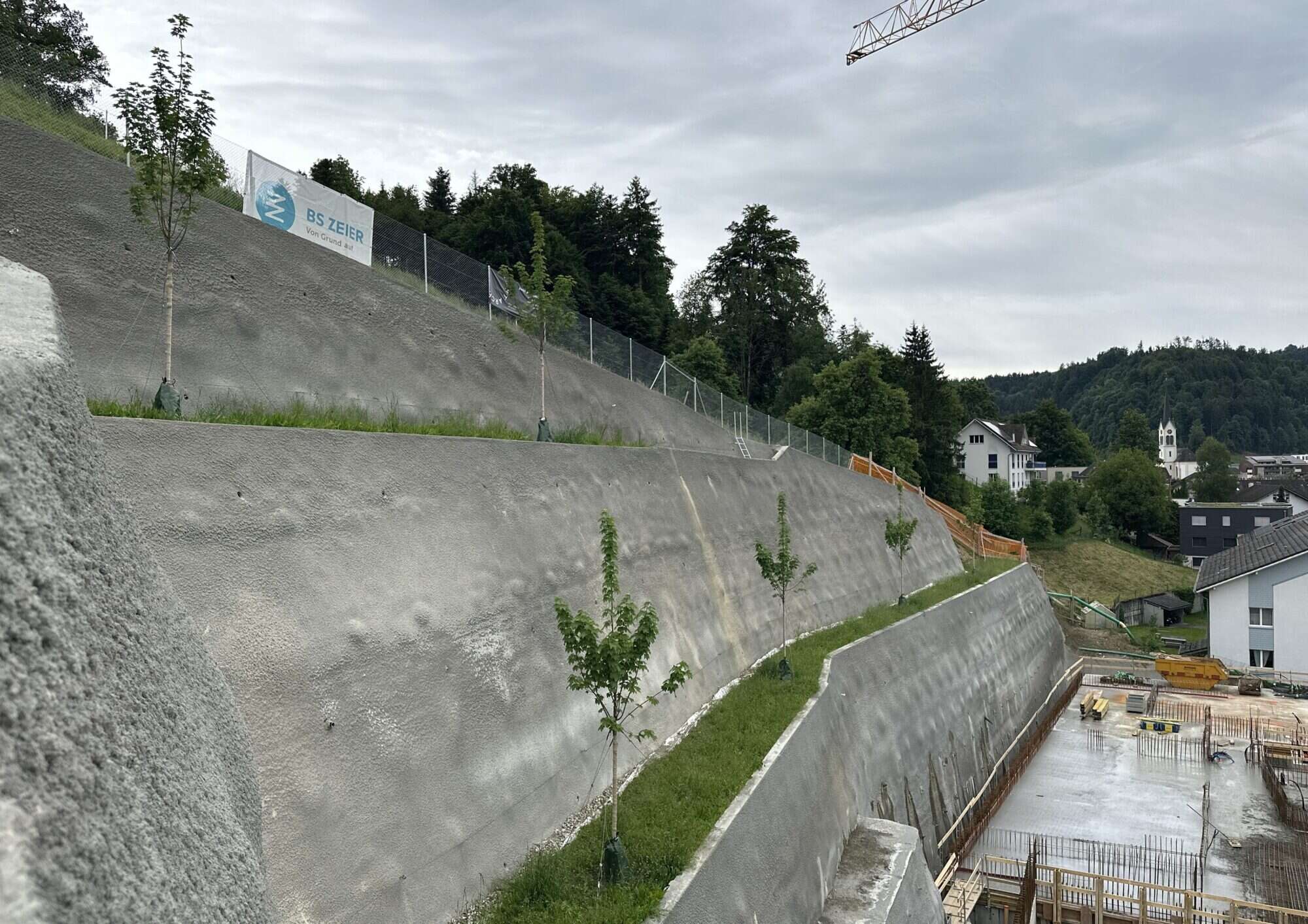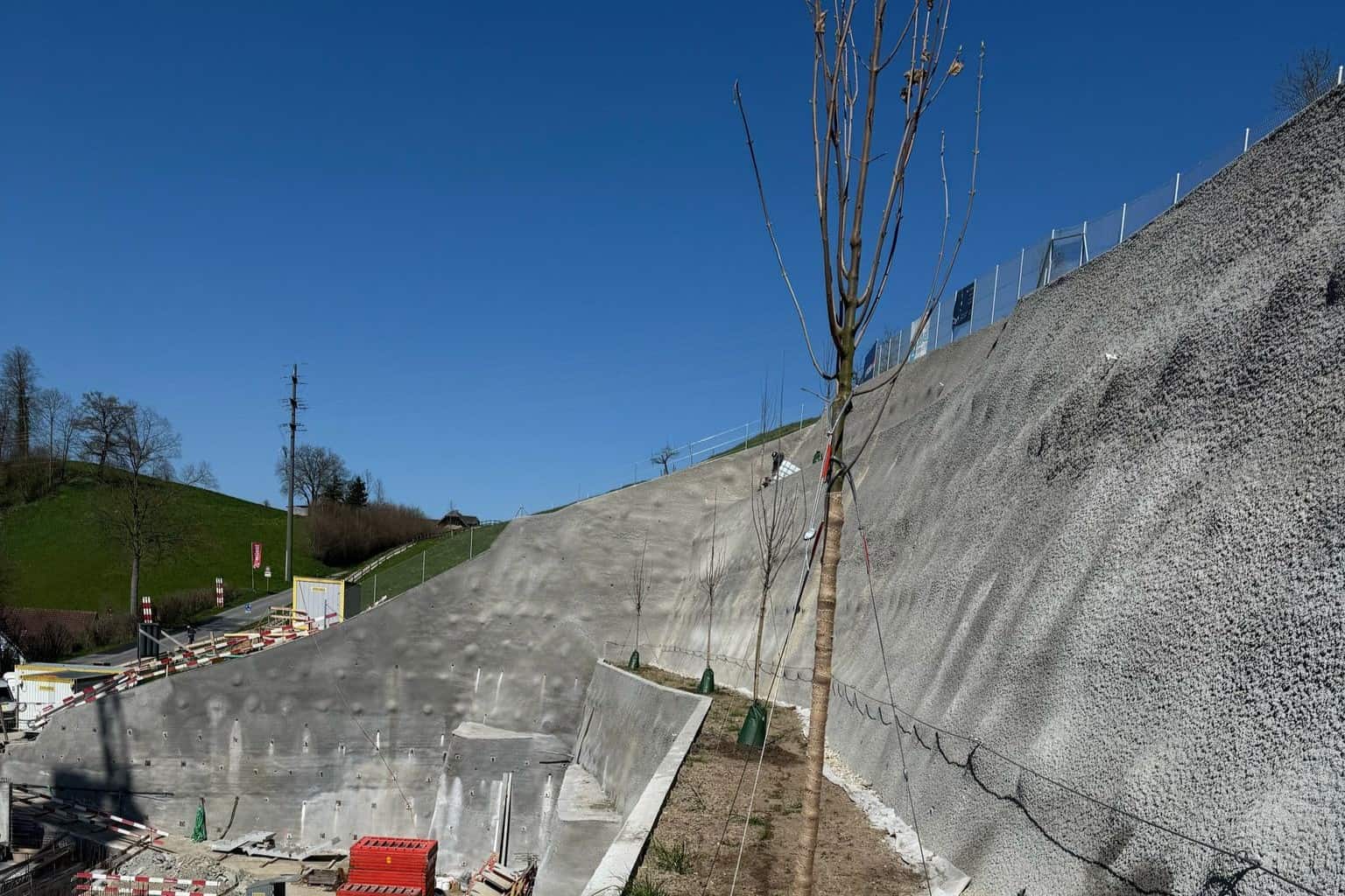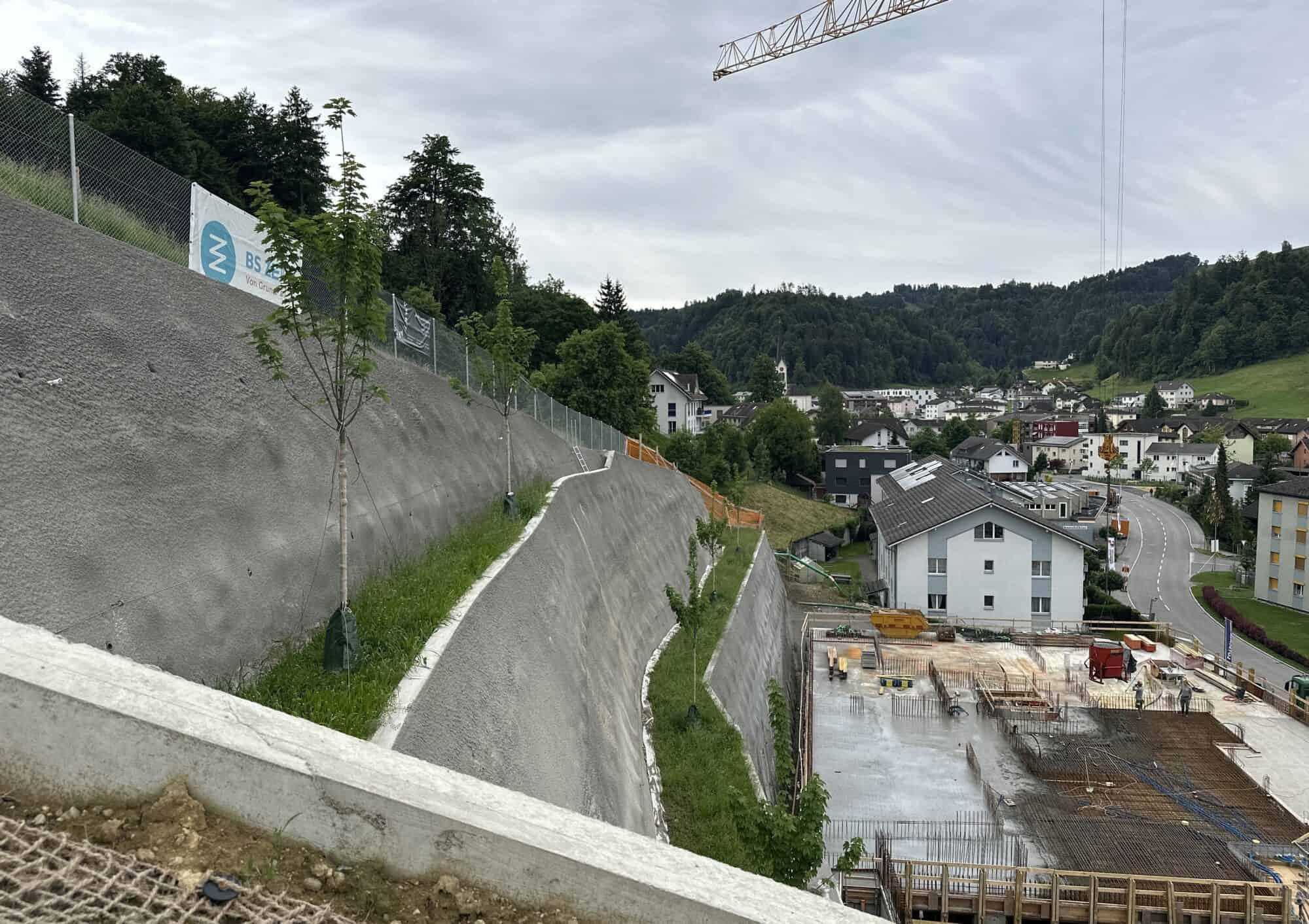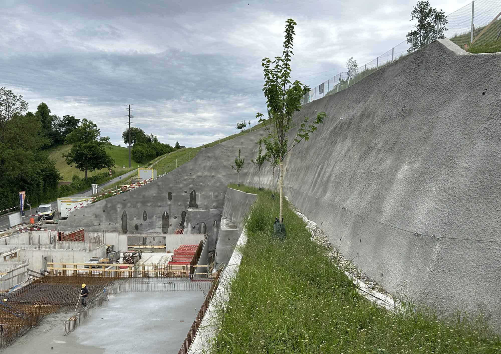 Für die geplante Begrünung des Hangs, welche durch eine permanente Baugrubenwand gesichert wurde, sind bereits sechs Bergahorne gepflanzt worden. Dies gibt eine Vorahnung des natürlichen Bildes, welches den Hang durch die später ausgewachsene Ahornbäume mit zusätzlichen Sträuchern und Kletterpflanzen, prägen wird.