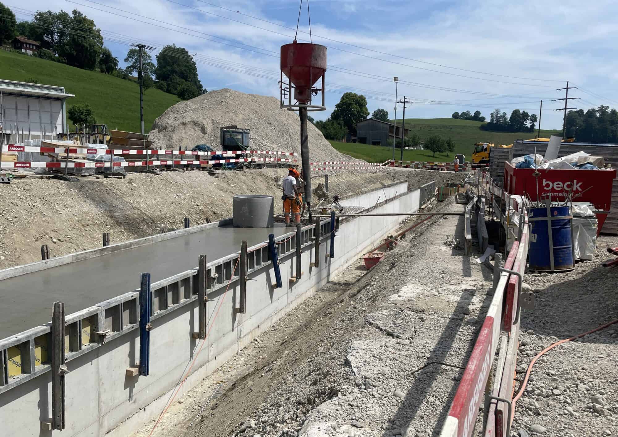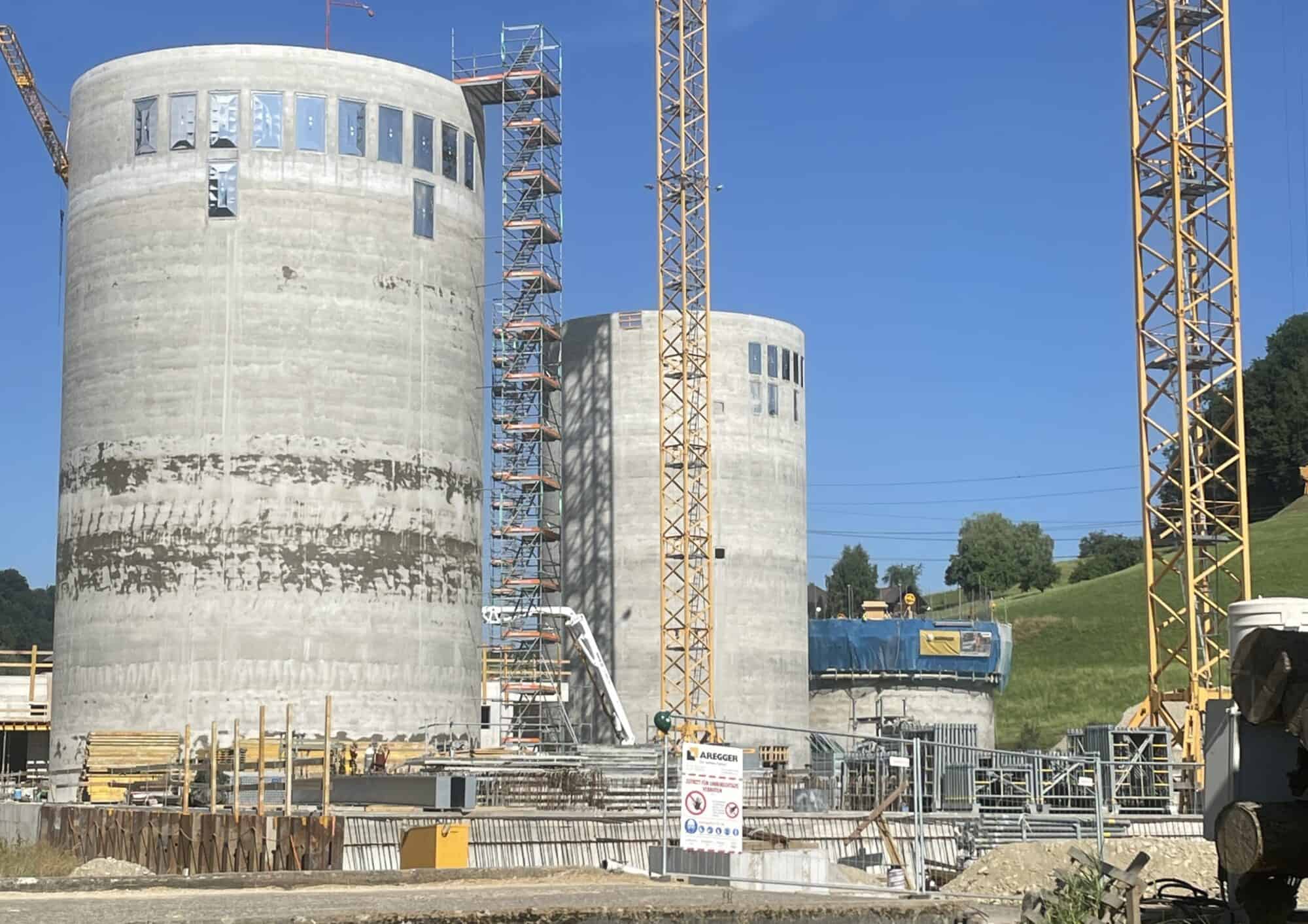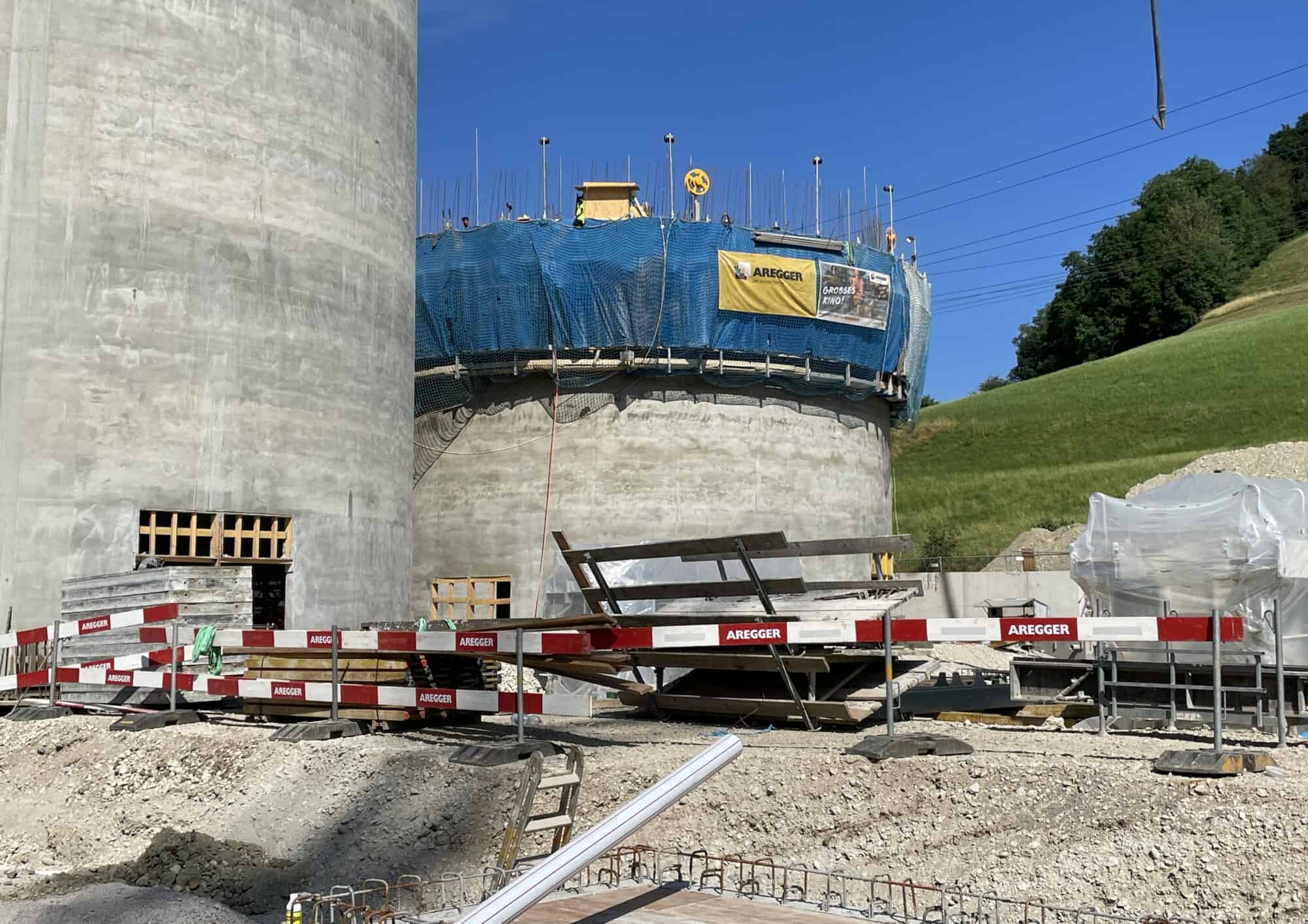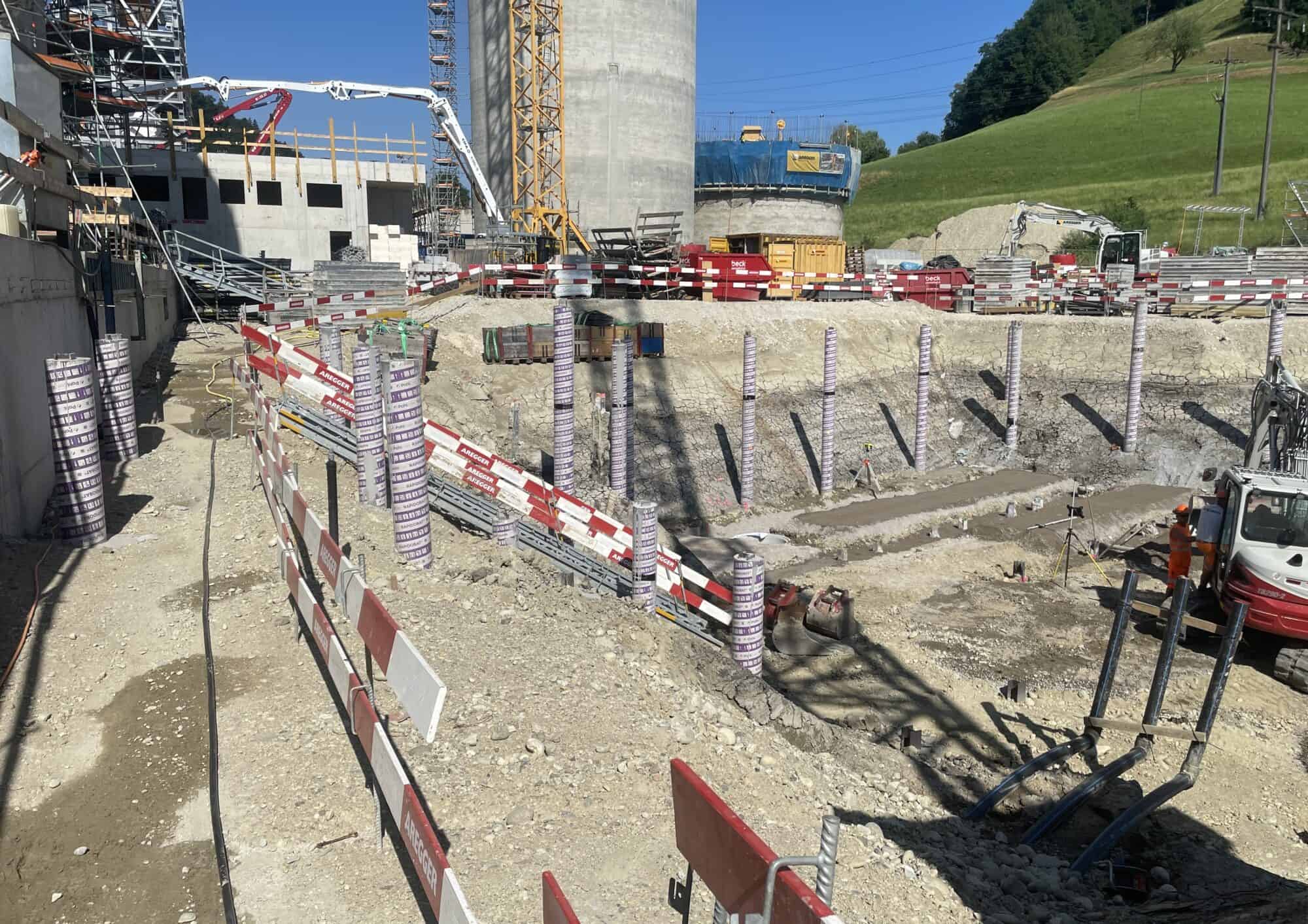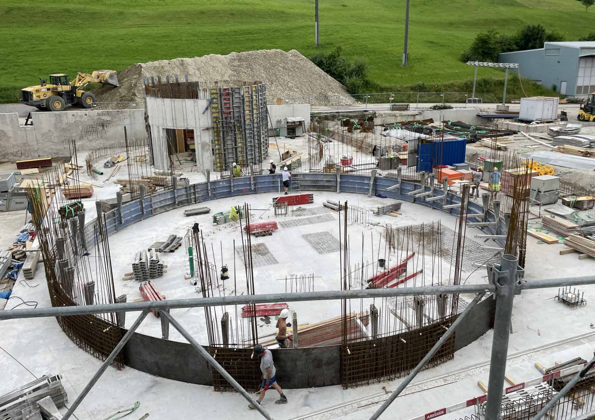 Im zweiten Baufeld, welches im Untergeschoss über 2’000m³ Wasser fassen kann, laufen die Arbeiten über Terrain auf Hochtouren. Neben dem bereits erstellten Silo, stehen auch schon Arbeiten für weitere Gebäude an.