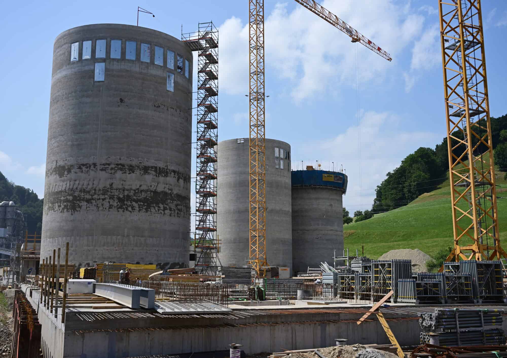 Weiter geht es zur Brecherhalle und den beiden Lagersilos, bei welchen das erste Silo bereits betoniert wurde und das zweite mit eiligem Tempo hinterhereilt. Hier wird der nächste Schritt die zweite Bodenplatte mit dem Sockel sein, damit anschliessend die Halle im Stahlbau erstellt werden kann.