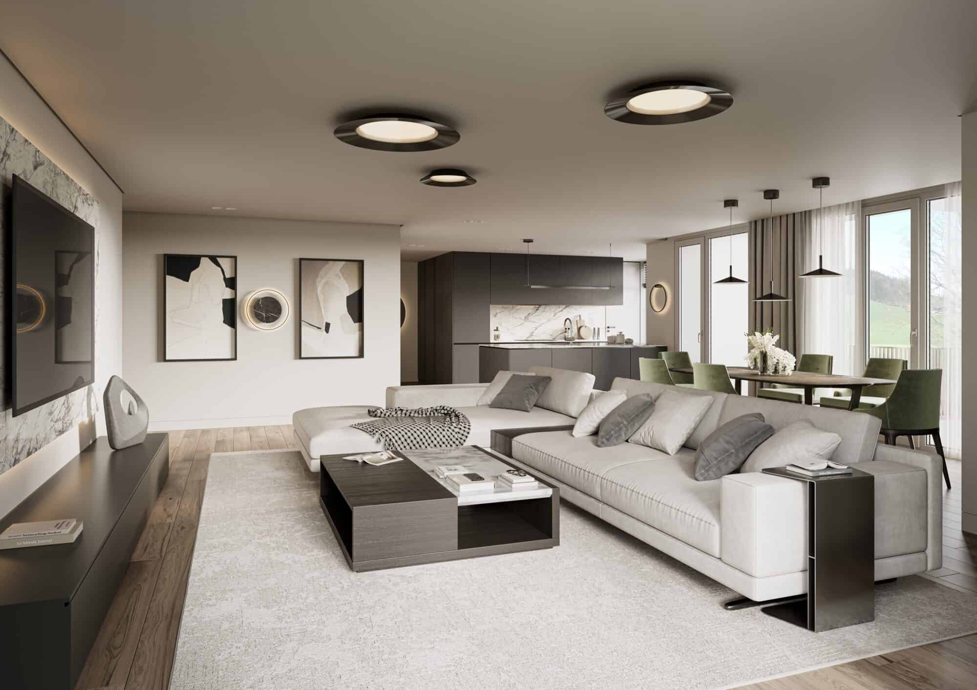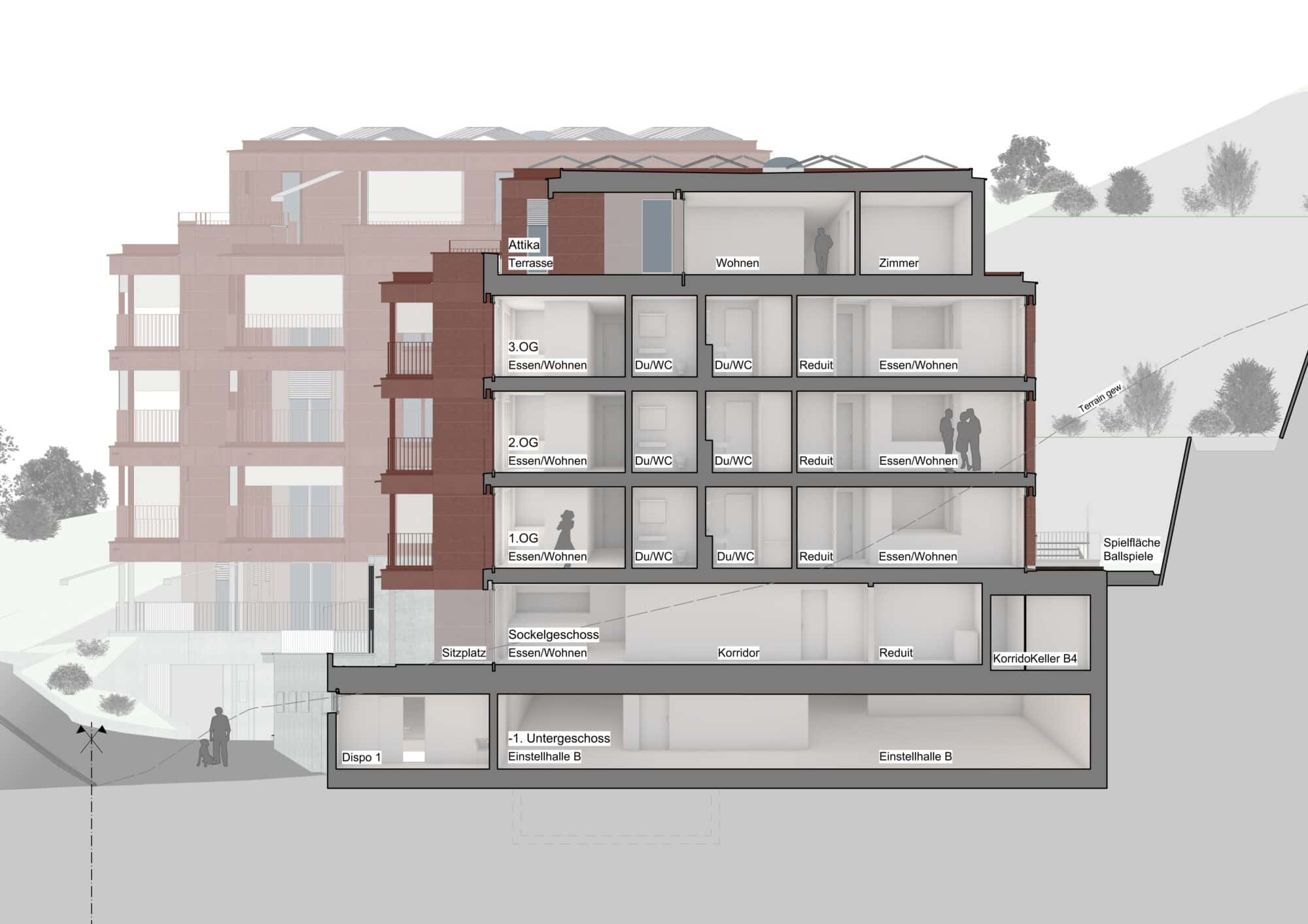 Der Wohnungsmix umfasst alle Wohnungsgrössen von der 2½ Zimmerwohnung bis zur 6½ Zimmer-Attikawohnung. Zum umfassenden Parkierungsangebot in der Einstellhalle stehen auch noch 5 Disporäume als Hobby- oder Lagerräume zum Verkauf. Die massive Bauweise und die Nachhaltigkeit der verwendeten Materialien ist für die Bauherrschaft von zentraler Bedeutung.