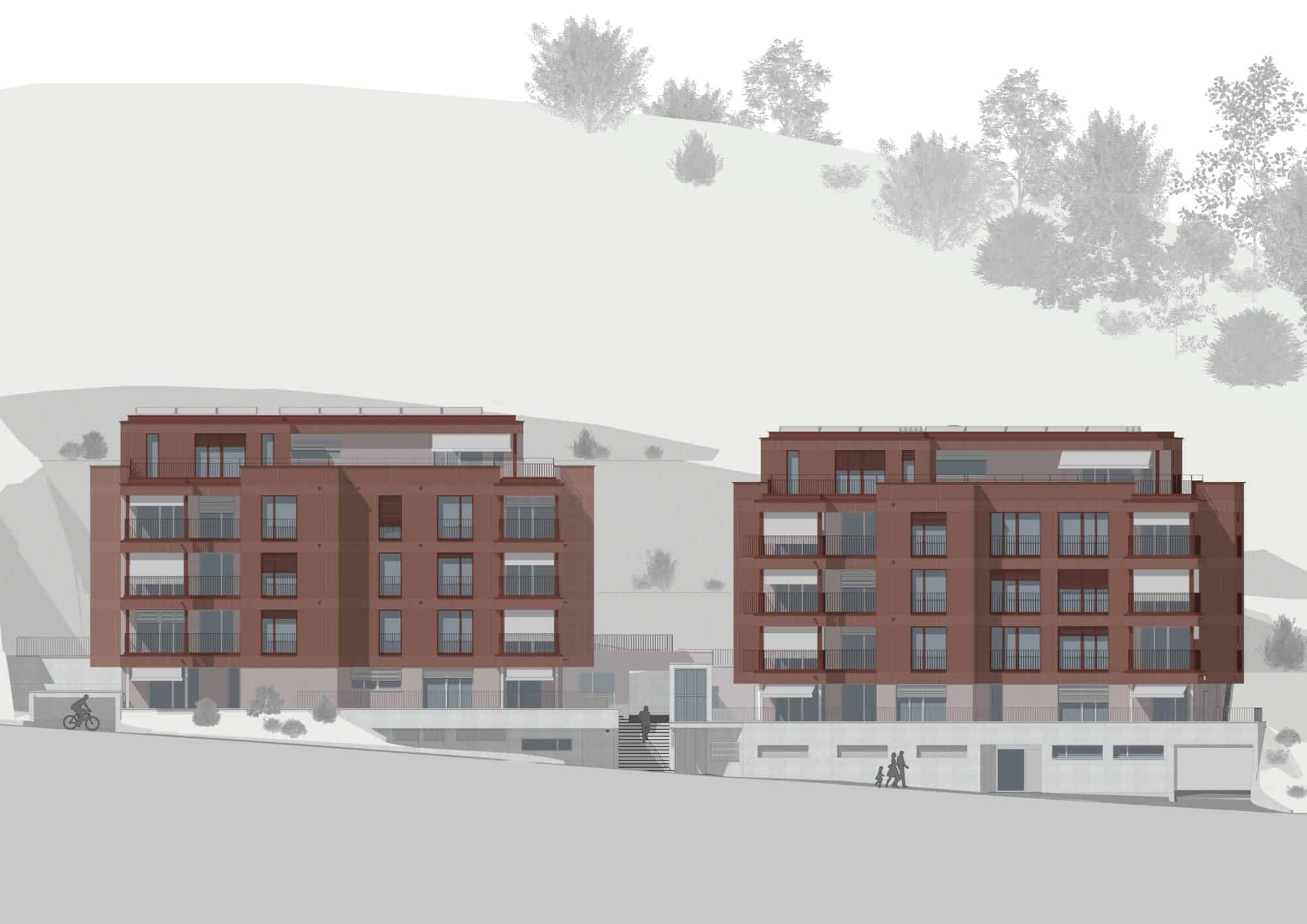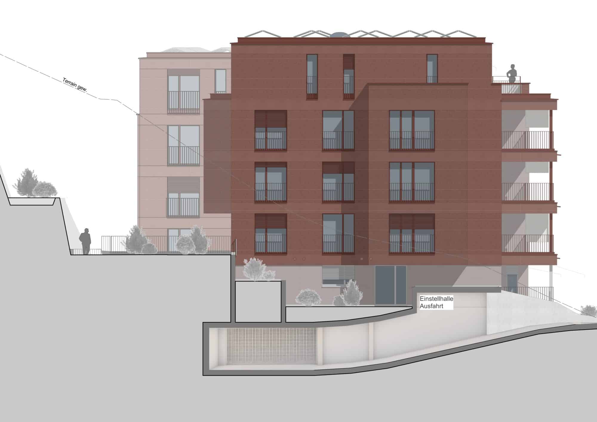 Entlang der Unterdorfstrasse von Menznau Richtung Geiss entstehen auf dem Grundstück Nr. 1299 zwei Mehrfamilienhäuser. Für die Planung der beiden Gebäudevolumen erweist sich die ausgeprägte Hanglage als grosse Herausforderung. Die beiden Baukörper sind auf die durchgehenden Einstellhalle des Untergeschosses gestellt und weisen je ein Sockelgeschoss, drei Wohngeschosse sowie ein Attikageschoss auf. Die gemeinsame Erschliessung zwischen den beiden leicht gegeneinander ausgedrehten Bauten erfolgt über eine einladende Aussentreppe sowie einem Aussenlift, die das Strassenniveau mit dem Sockelgeschoss verbinden.
