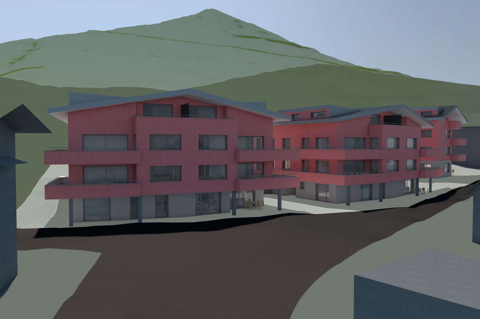 Unser Vorschlag umfasste drei Mehrfamilienhäuser mit total 18 Wohnungen und einer Einstellhalle mit 33 Autoabstellplätzen. Der Wohnungsmix der Mietwohnungen umfasst nebst vier 2½ Zimmerwohnungen hauptsächlich familienfreundliche 3½ und 4½ Zimmerwohnungen. Die Gebäude sind in Massivbauweise mit einer hinterlüfteten Holzverschalung und einem Schiefer gedeckten Dach projektiert. Die rot eingefärbte Holzverschalung nimmt dabei die traditionelle Farbgebung von historischen Holzbauten im ländlichen Raum auf und fügt die grossen Volumen sehr schön in die Umgebung ein.