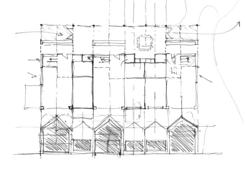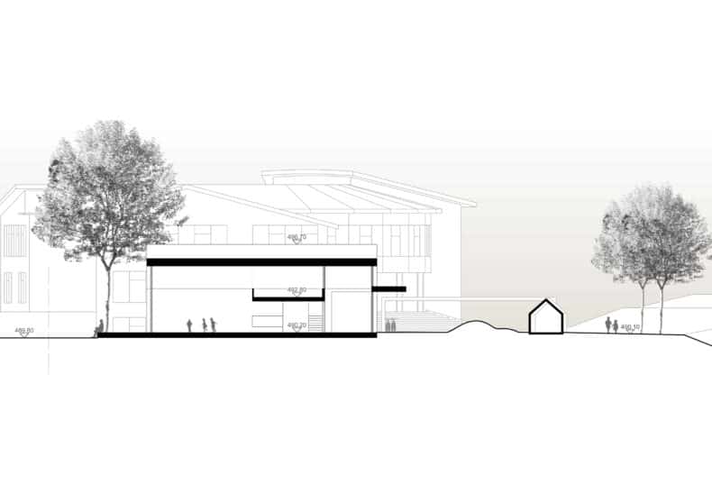 Die bestehende Gebäudestruktur des Schulhauses Eischachen wird an drei Stellen ergänzt, ohne dabei die ursprüngliche architektonische Grundform zu tangiere oder zu beeinträchtigen. Die Erweiterung des Lehrerbereichs, sowie die Neuorganisation und Vergrösserung des Singsaals ergänzen sich ideal und werden mittels eines Anbaus gegen Nordosten realisiert. Ein neuer Gebäudeteil mit Klassenzimmern und weiteren Arbeitszimmern schliesst den Klassentrakt gegen Norden ab. Auf der westlichen Seite des Korridors angelagerten Gruppenräume in Form von zwei schlichten Türmen, befinden sich in unmittelbarer Nähe zu den jeweiligen Klassenräumen. Zwei kleine Spielhöfe nördlich der Gruppenräume dienen als Treffpunkte und können auch als Freiluftklassenräume Verwendung finden. Die Intervention nimmt die Formensprache des bestehenden Volumens subtil auf und ergänzt diese in natürlicher Weise. Die bestehenden Aussenspielflächen werden durch diesen Vorschlag vollumfänglich erhalten im östlichen Bereich gar neu erschossen